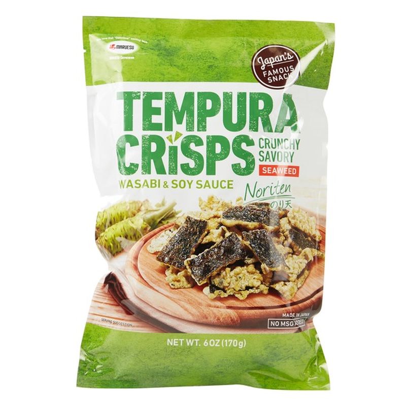 Maruesu seaweed tempura crisps. But nori is exponentially healthier than your typical Lays salt and vinegar chips. These seaweed have been coated with tempura batter and seasoned to create a crunchy and savory snack. 6 oz 170 g.