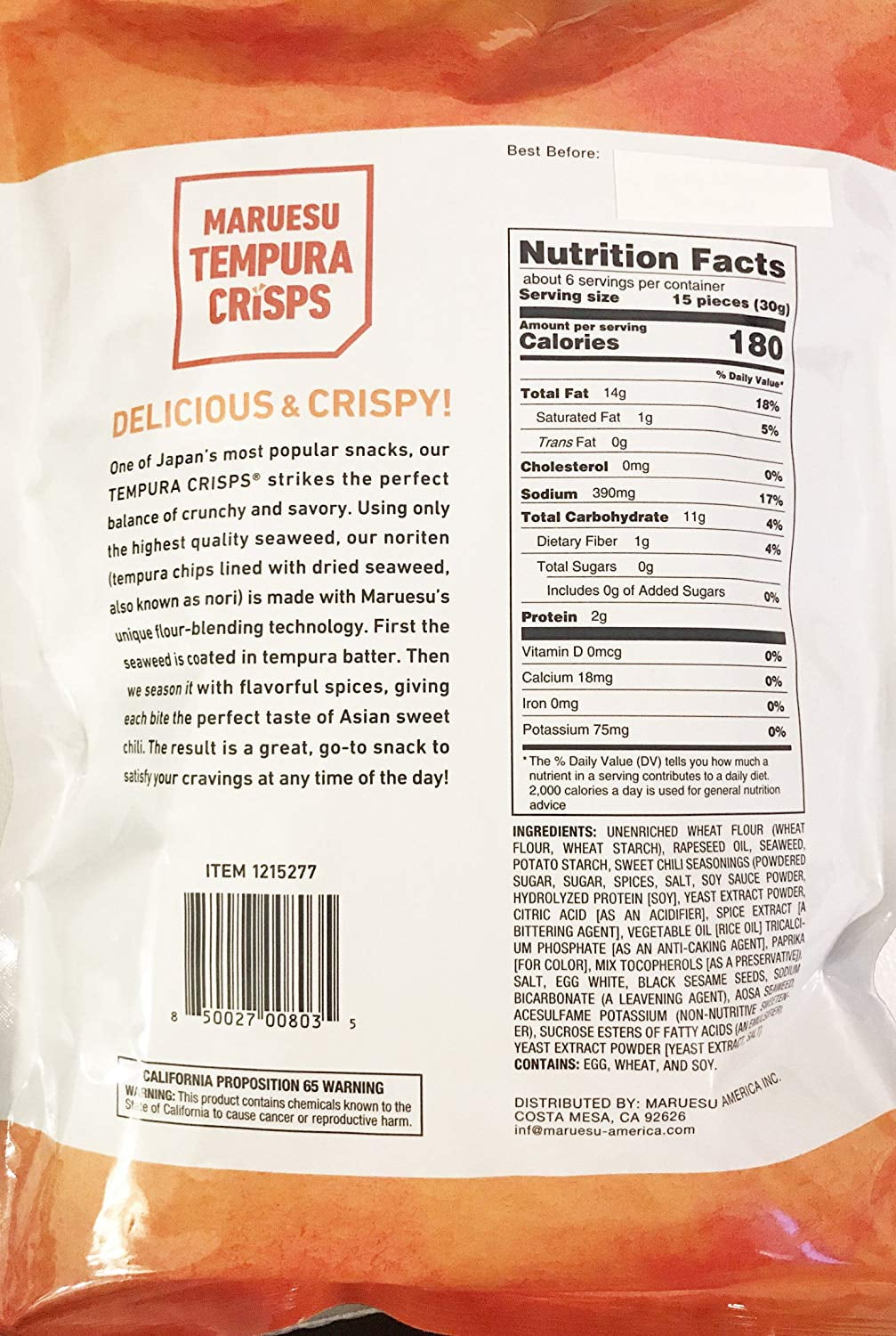 Nori is the Japanese term for seaweed in particular the pressed and salted kind that you can find at most Asian supermarkets. Maruesu Seaweed Tempura Crisps are priced at 699 for the 6-oz bag. Tempura Crisps Asian Sweet Chili Maruesu 15 pieces 180 Calories 110 g 140 g 2 g 1 g 0 mg 1 g 390 mg 0 g 0 g.