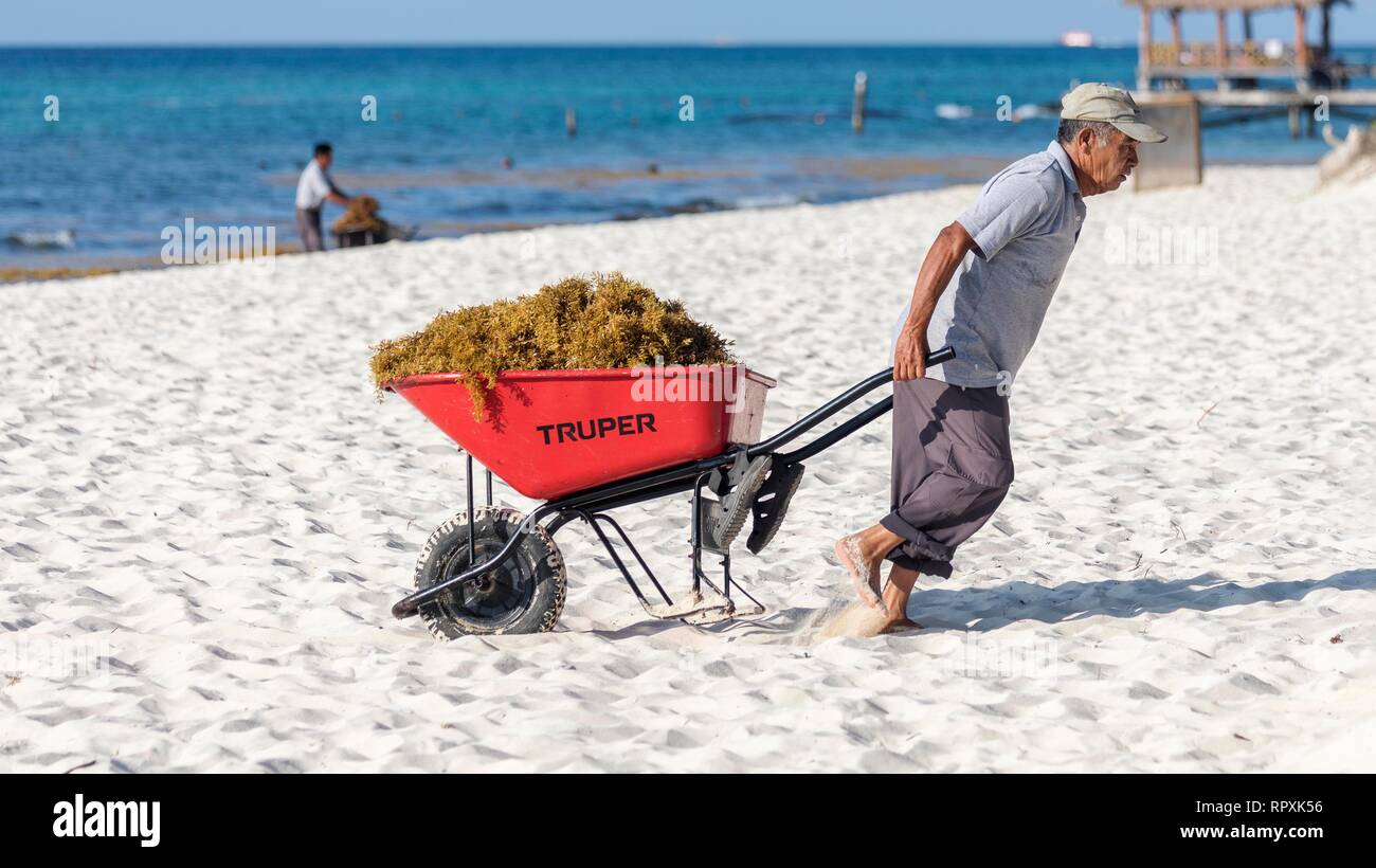 Riviera Maya Mexico July 27 2018 Mexican Male Worker Shows A Wheel Barrow Full Of Problem Sargassum Seaweed As He Cleans Up A Beach On The Caribb Stock Photo Alamy